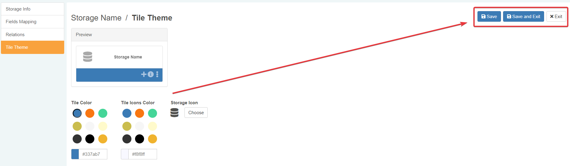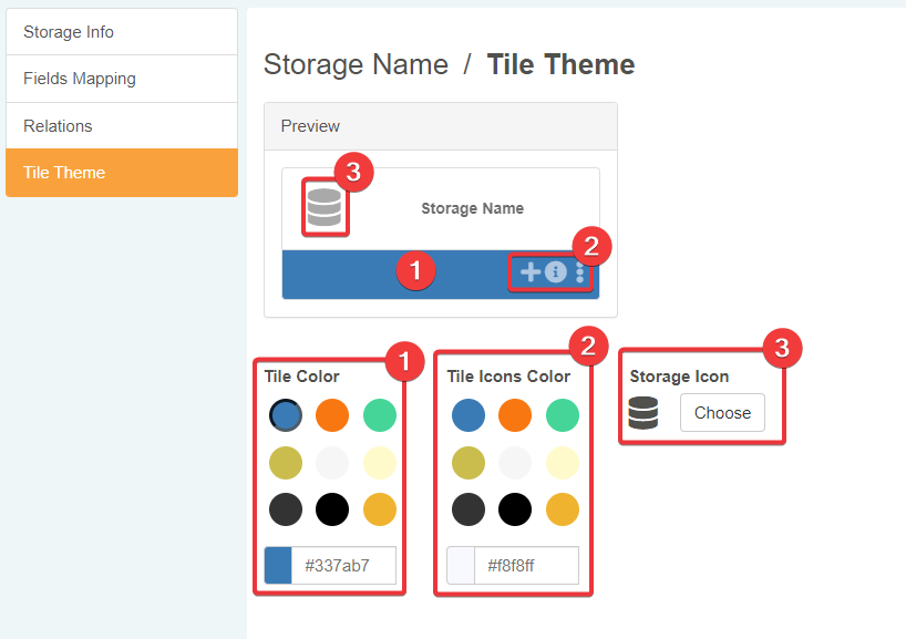 Click on the Tile Theme tab in the Storage Editor's sidebar. The action leads to the sub-panel where you can customize the Storage's appearance in the Home.