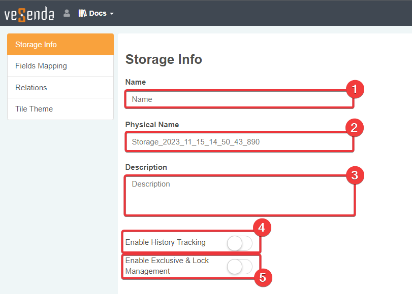 optionalEnable History Tracking: Turn on the toggle-switch to record every change made on this Storage by users and applications. - (5)