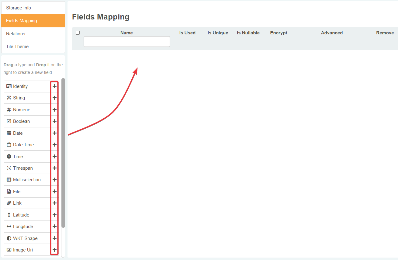 Click on the Fields Mapping tab in the left sidebar. The action leads to the panel where you can add fields to the Storage.