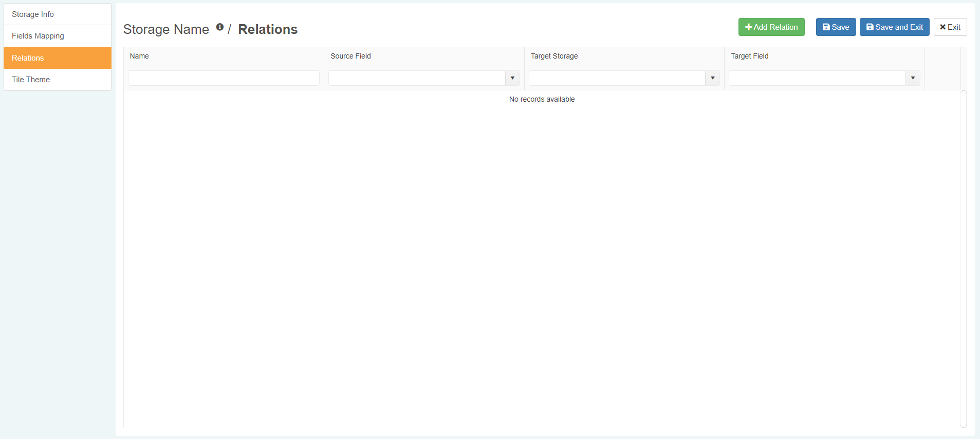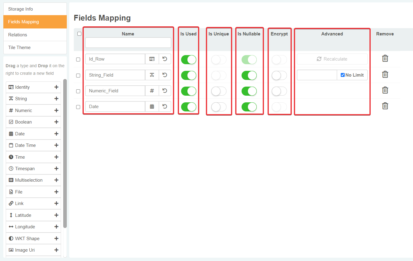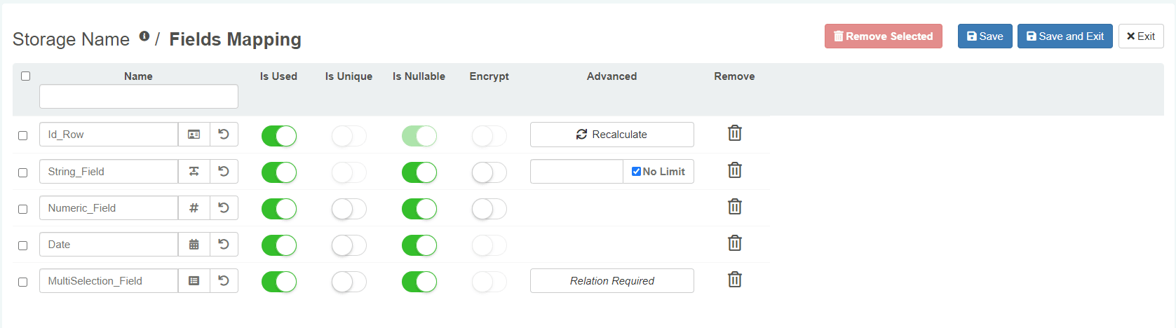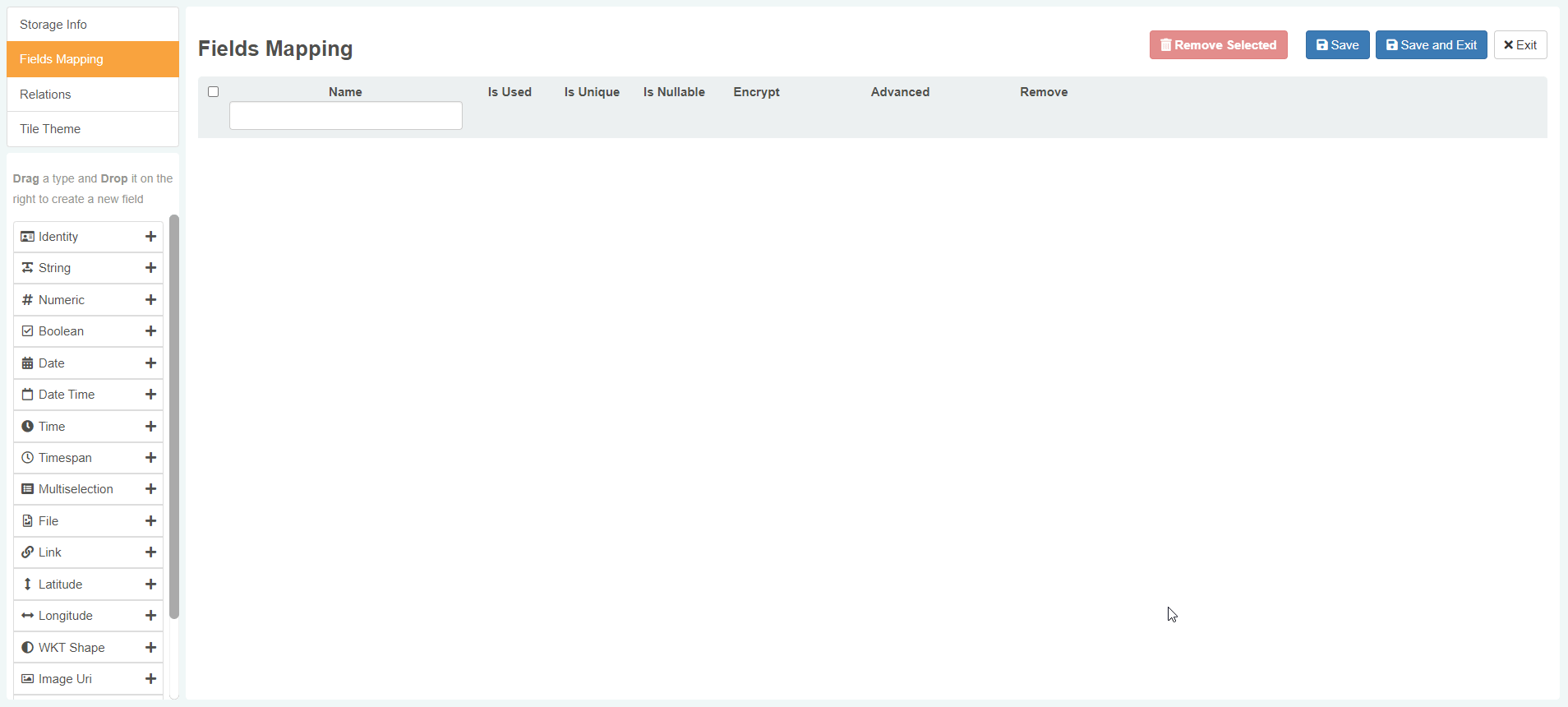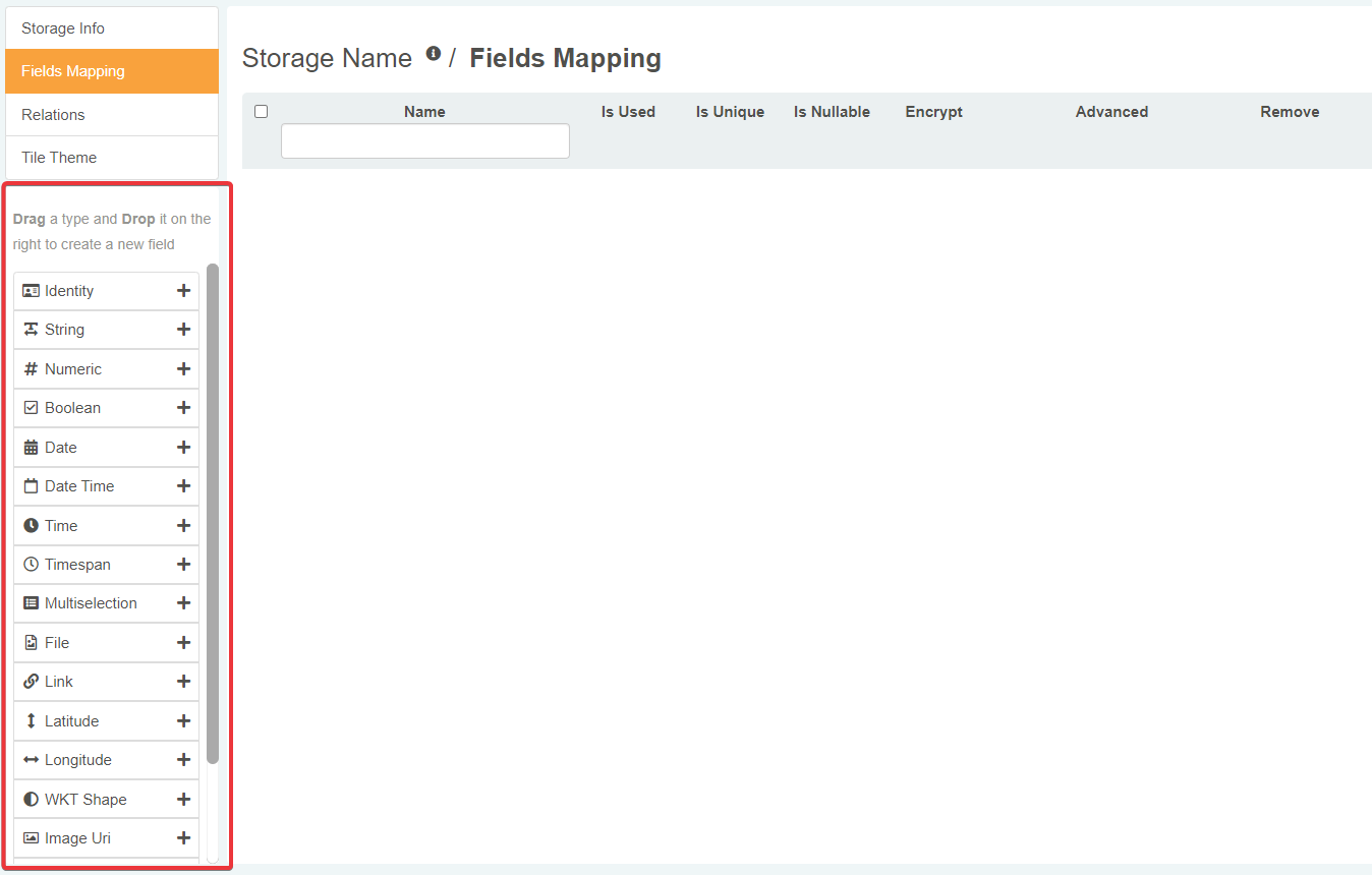 The Fields Mapping sub-panel enables you to add fields to the Storage.