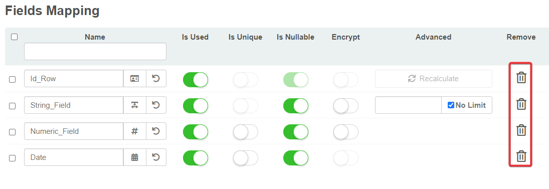- If the field is an Identity field, Advanced displays the Recalculate button. Recalculate button triggers the recalculation of the values of all the rows' unique Ids.