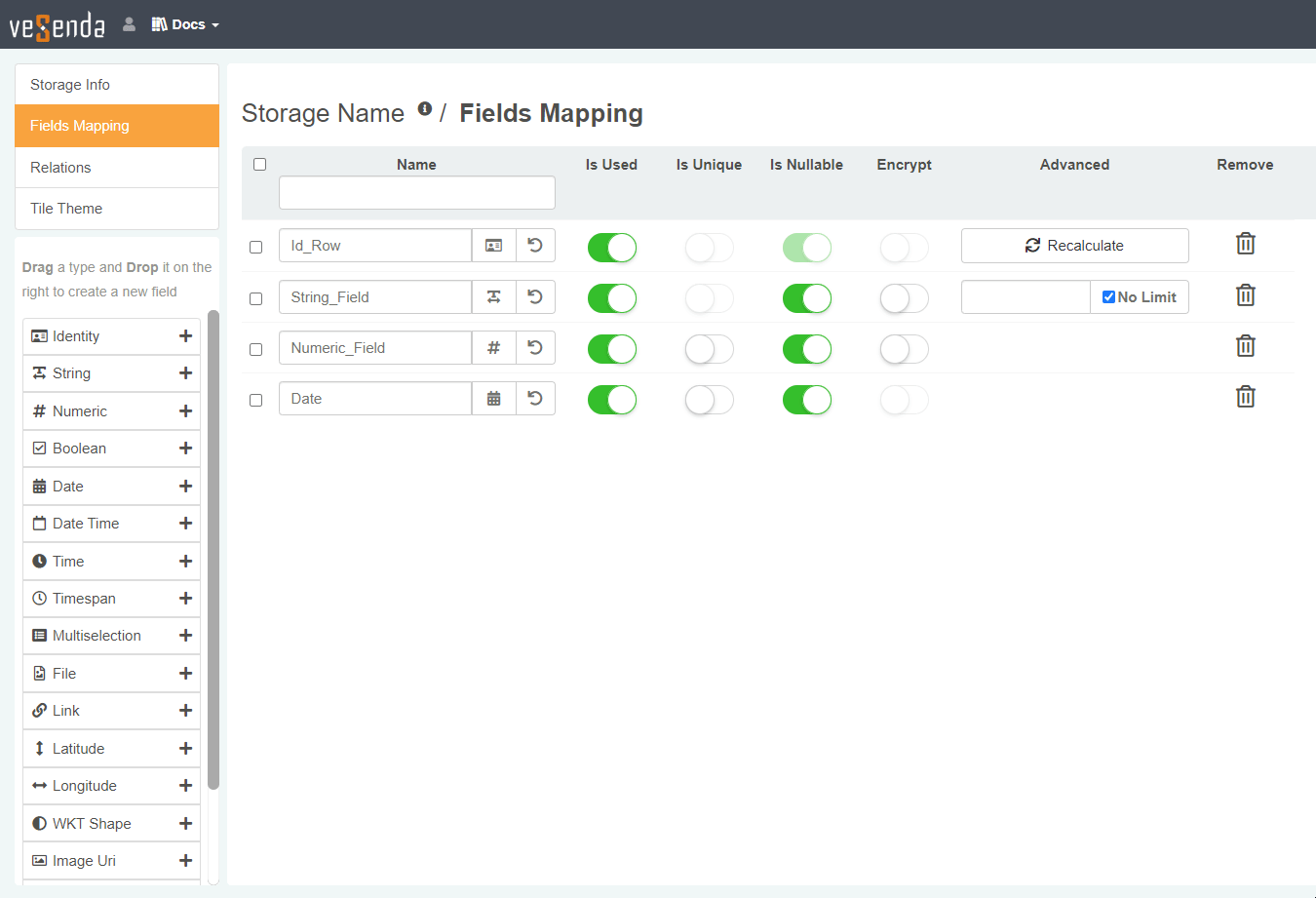 This guide assumes that you are adding or editing fields during the creation. There might be the case where your are editing an existing Storage. Be careful about deleting fields. Your choice might affect how the applications built on the Storage work.