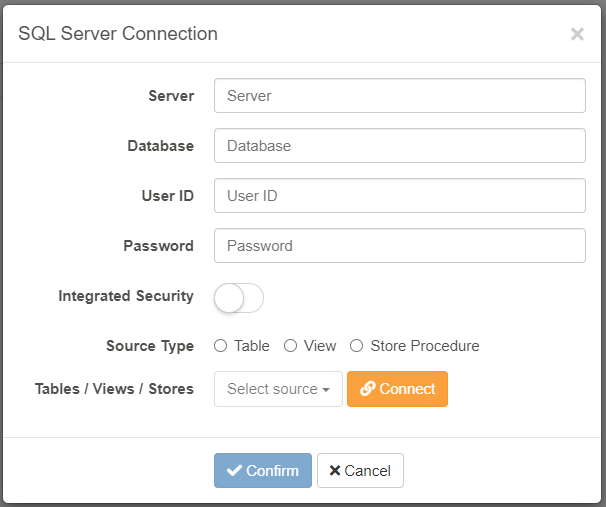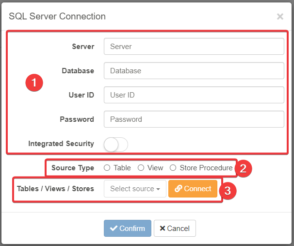 If you choose SQL, a window will ask information to authenticate with the external SQL database.