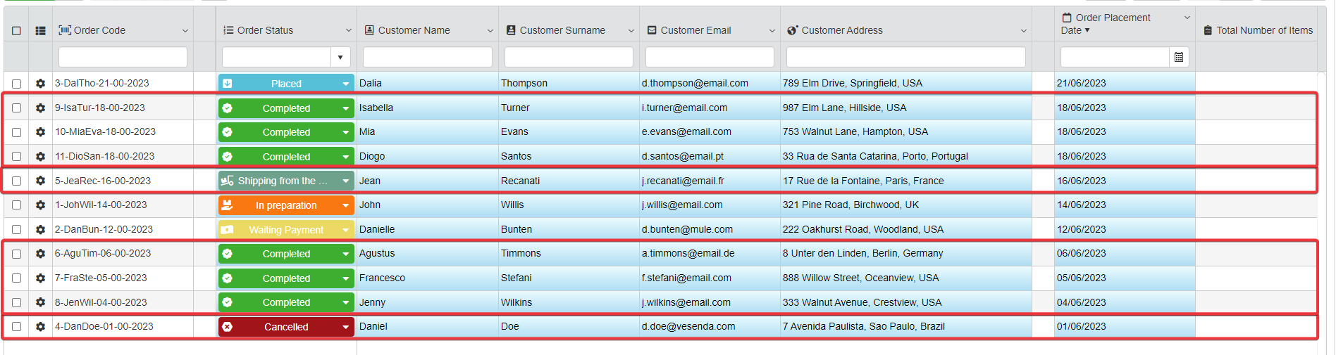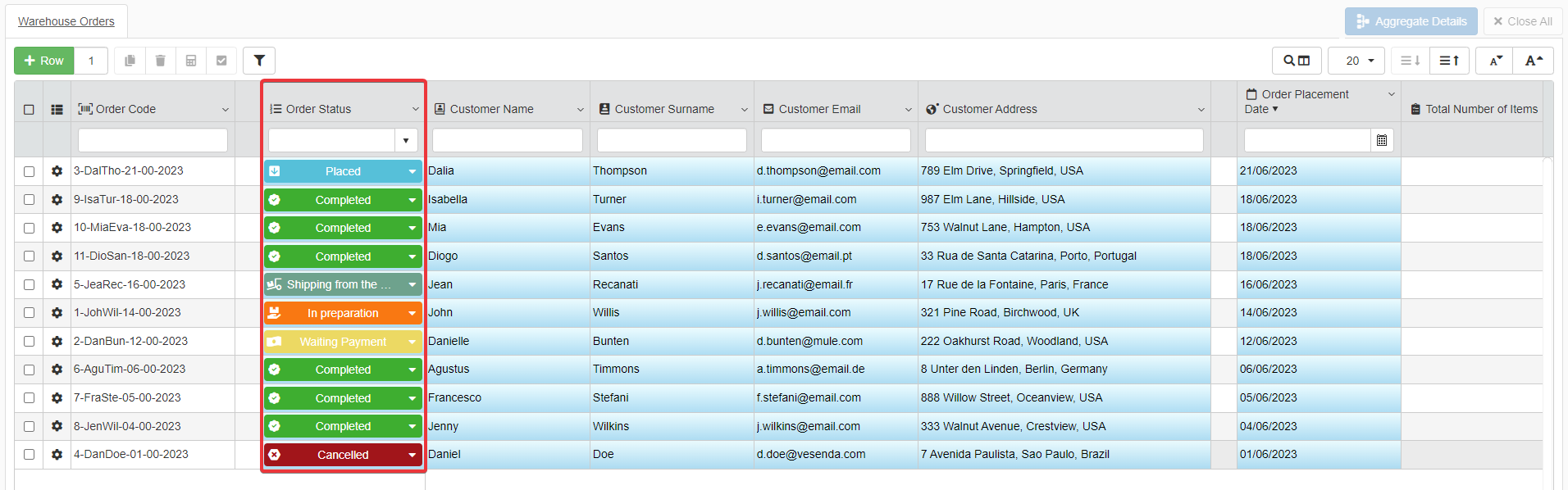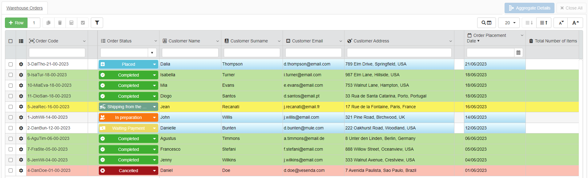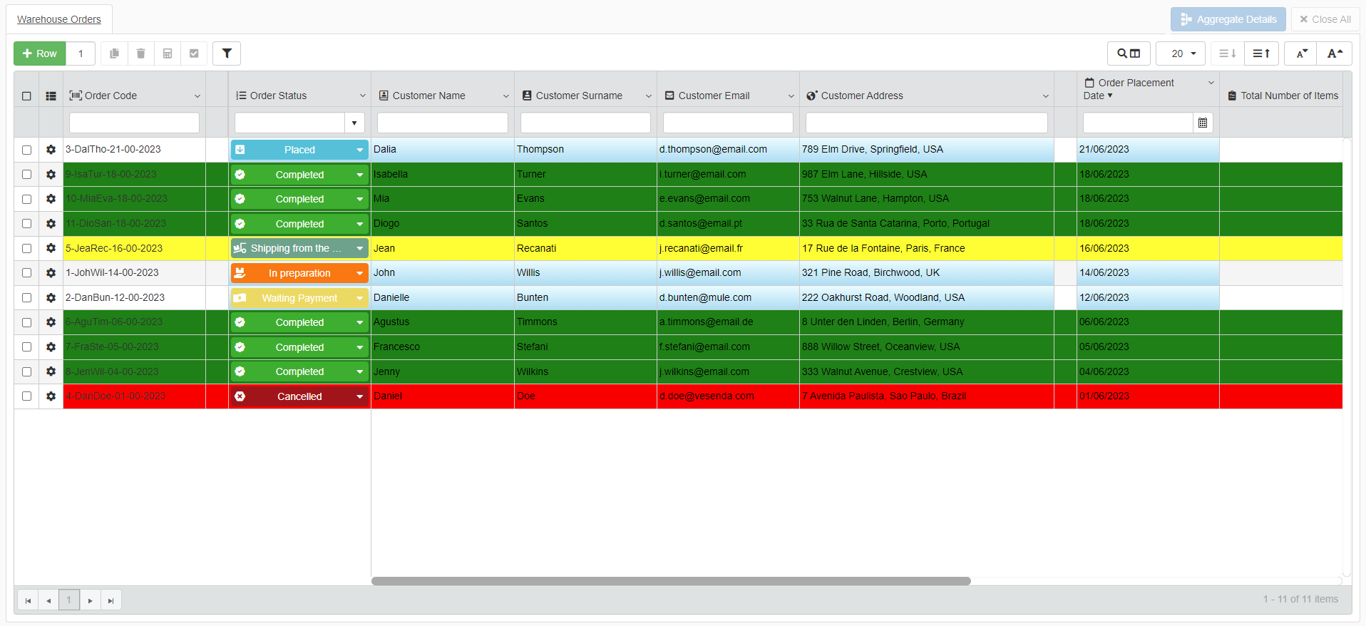 Now, the application highlights of green the Completed orders, yellow the orders that are shipping from the Warehouse, and red the Cancelled orders.