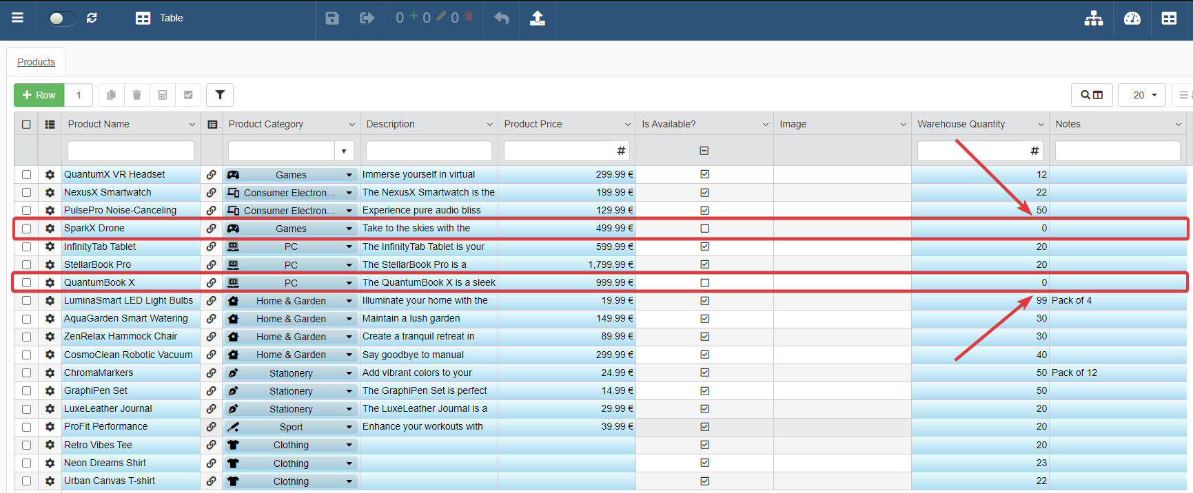 Users might need something highlighting when an item is out of stock without checking the Availability or Quantity fields. A solution is using a Formula highlighting the item's name of red when is not available and the quantity is 0.