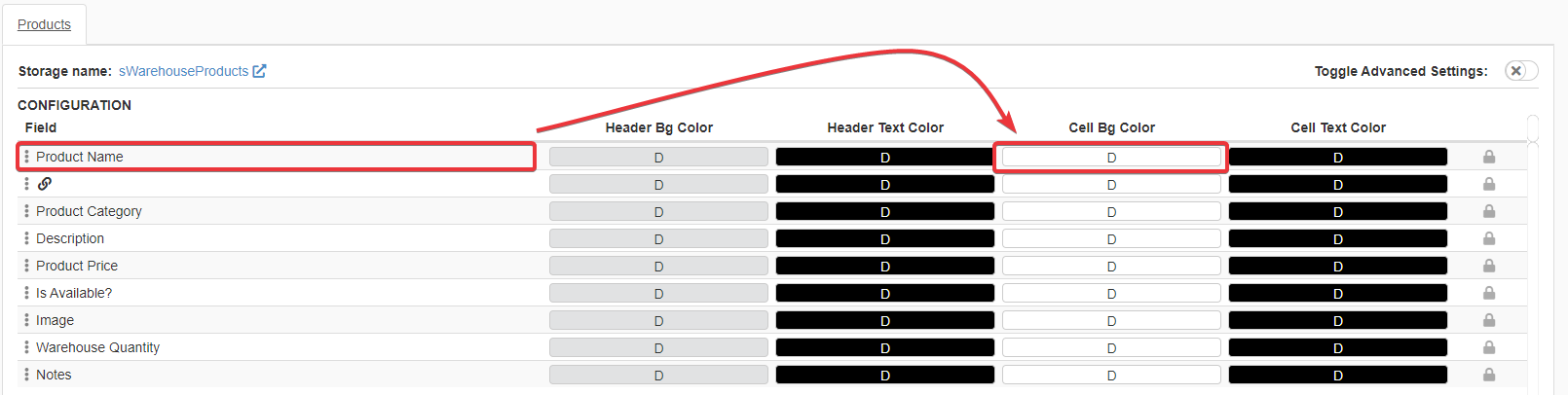 Then the Designer chooses the Master table Products and clicks on the Cell Bg Background button for the Product Name field. (Product Name is the String field recording the item's name.) The action opens the Color Settings window for that field.