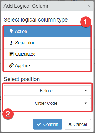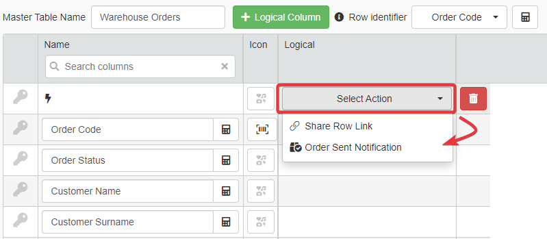 If you have chosen the Action type, click on the drop-down list and select the Custom Action to associate to the Logical Column. The icon on the Logical Column's cells will display the selected Custom Action's icon.