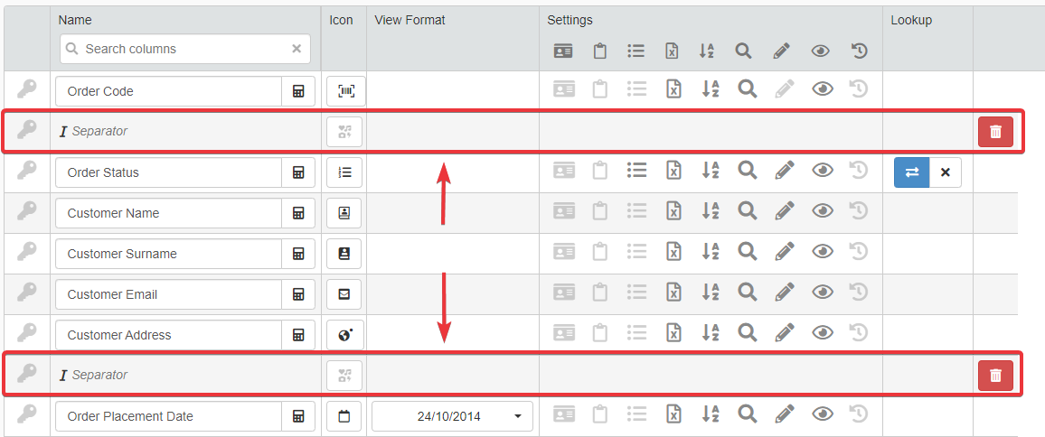 You can edit a Separator's position among the columns like any other column in the Layout panel. (See Change the Position and Size of a Column in the Table for more information about the Layout panel.)