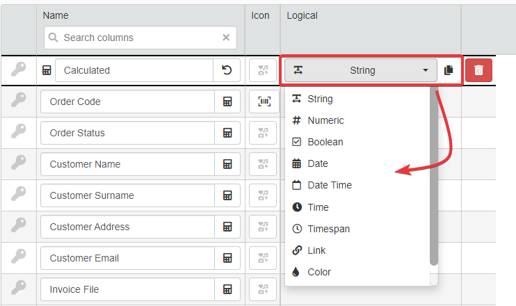 Choose a different data type by clicking on the drop-down list under the Logical column.