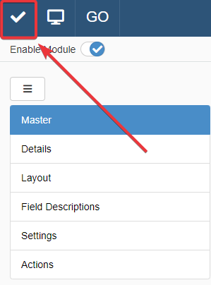 For Master Table, you can find the table settings under the Master sub-panel. The Master sub-panel is the first panel opening by default when you access the Design Mode.