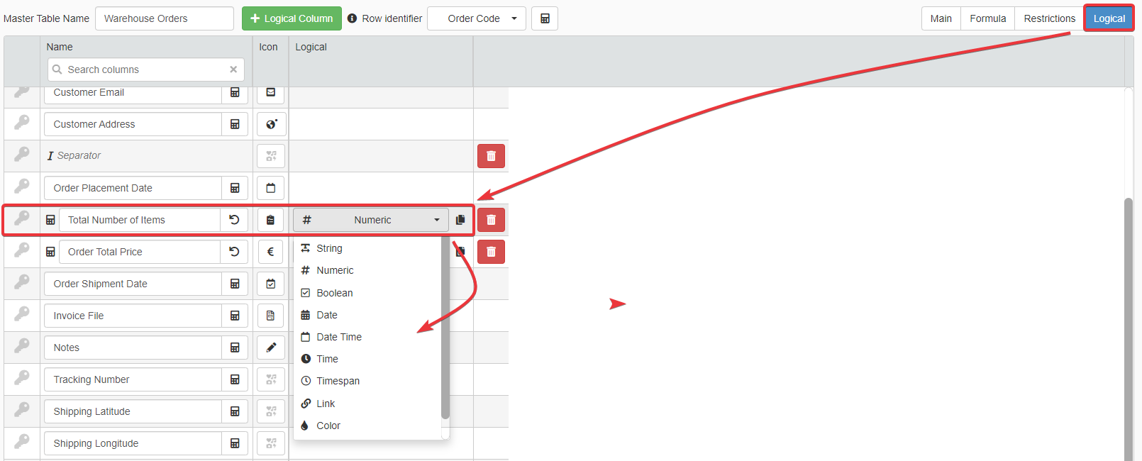After the configuration, the Designer chooses the data type Numeric from the drop-down list in the Logical sub-panel. Also, the Designer types "Total Number of Items" as column name.