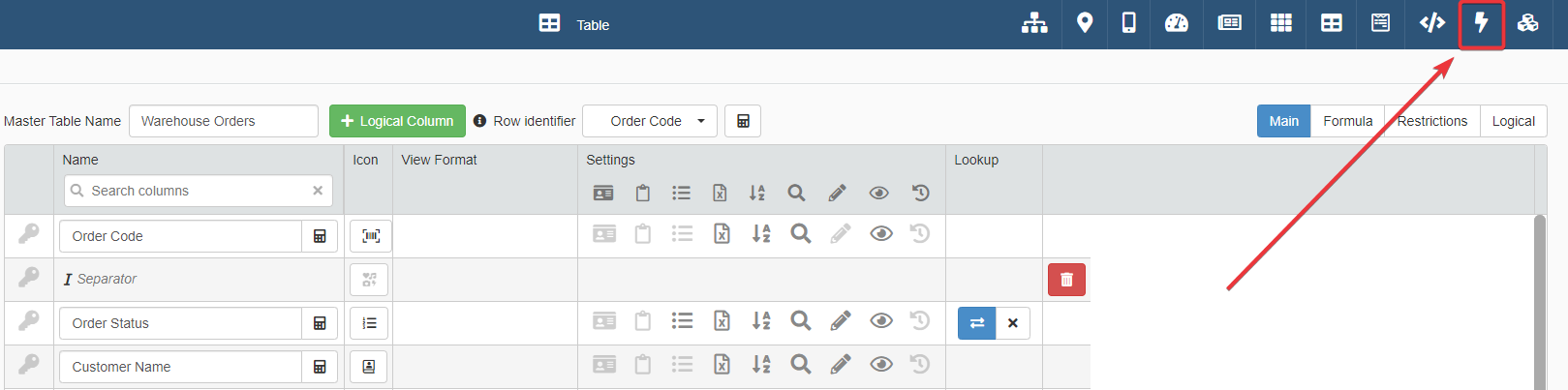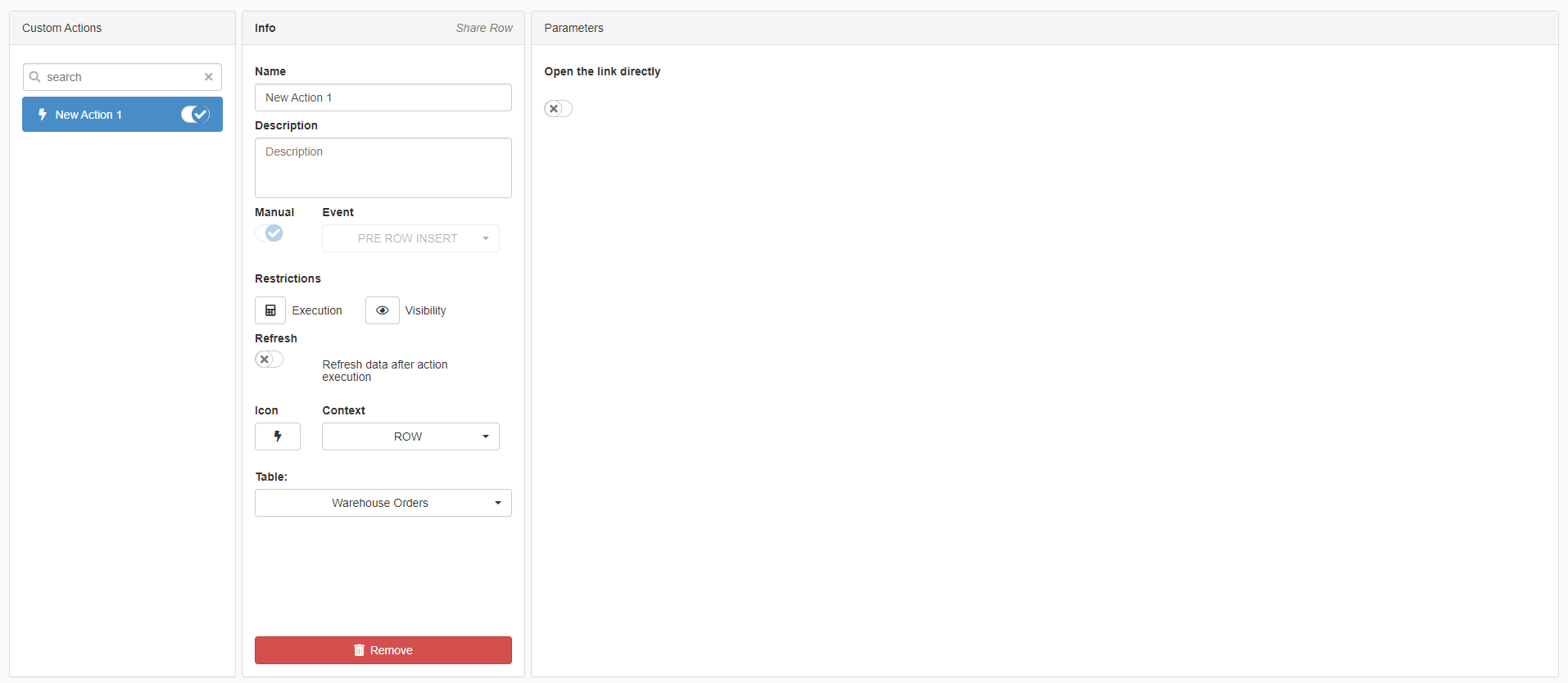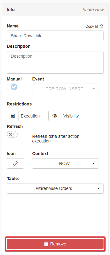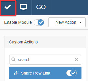 When you have completed the configuration, click on the Save button () in the top-left corner to save the Share Row Custom Action.
