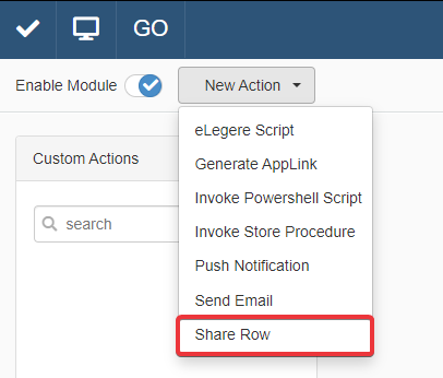 If you want to disable the Share Row Custom Action without deleting it from the Application, click on the toggle switch next to the Custom Action's name to hide it from the users.