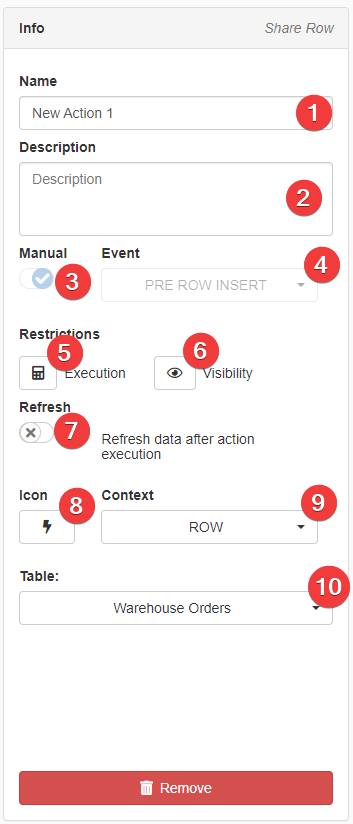 optionalInsert a description for the Share Row Custom Action. - (3) Manual Disabled for Share Row Custom Actions.