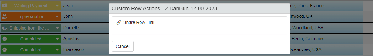 By default, clicking on a Share Row Custom Action opens a window with a link to the chosen row.