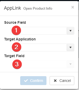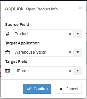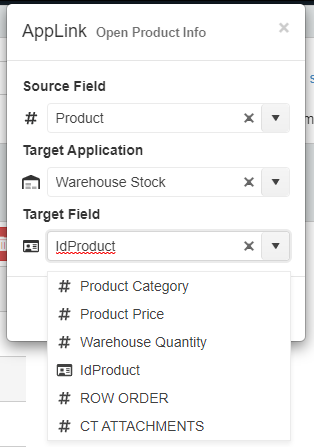 - Product is the Source Field. When you open the AppLink from a row, the AppLink filters the Target Application by the row's value of the Product field.