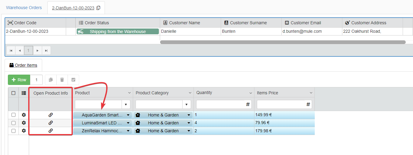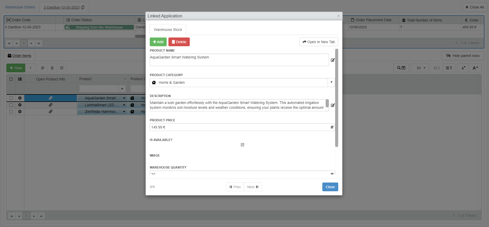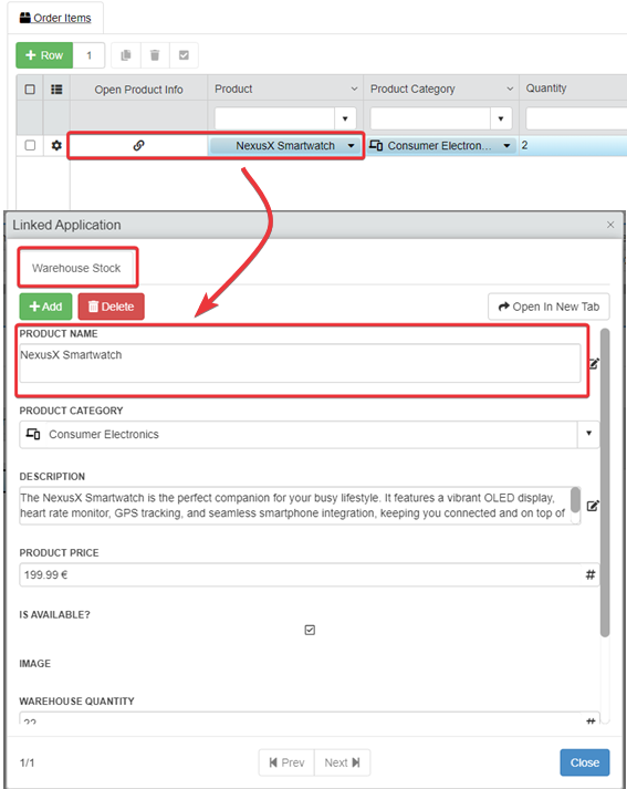 The solution involves an AppLink "Order Product Info" in the Order Items Detail table. The AppLink will open the chosen product's row from Warehouse Stock in a window without leaving Warehouse Orders.