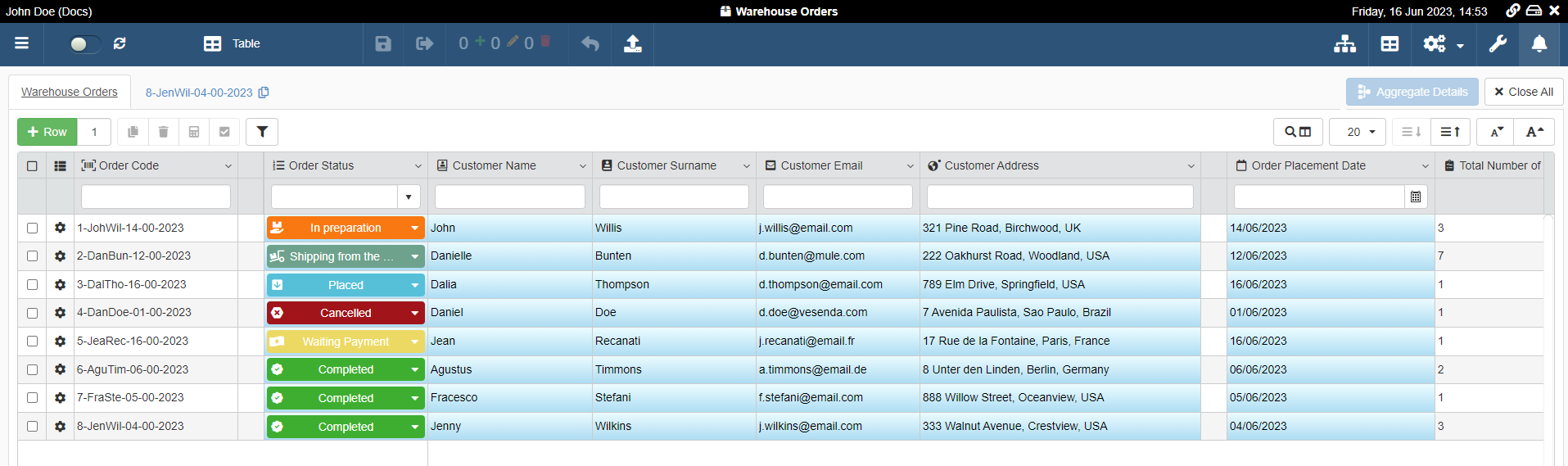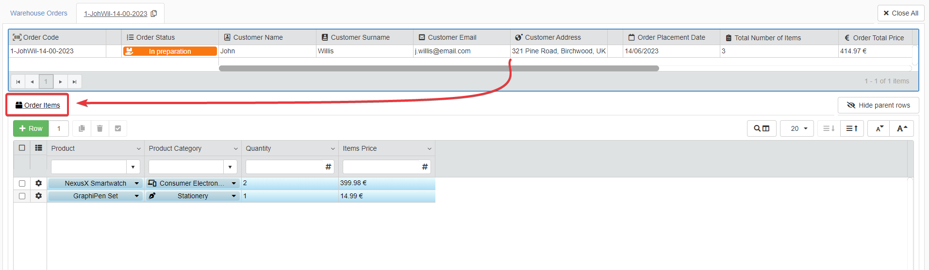 In Warehouse Orders, each Master row is an Order from a Customer. Each Order has a Detail table called Order Items containing the list of purchased items.