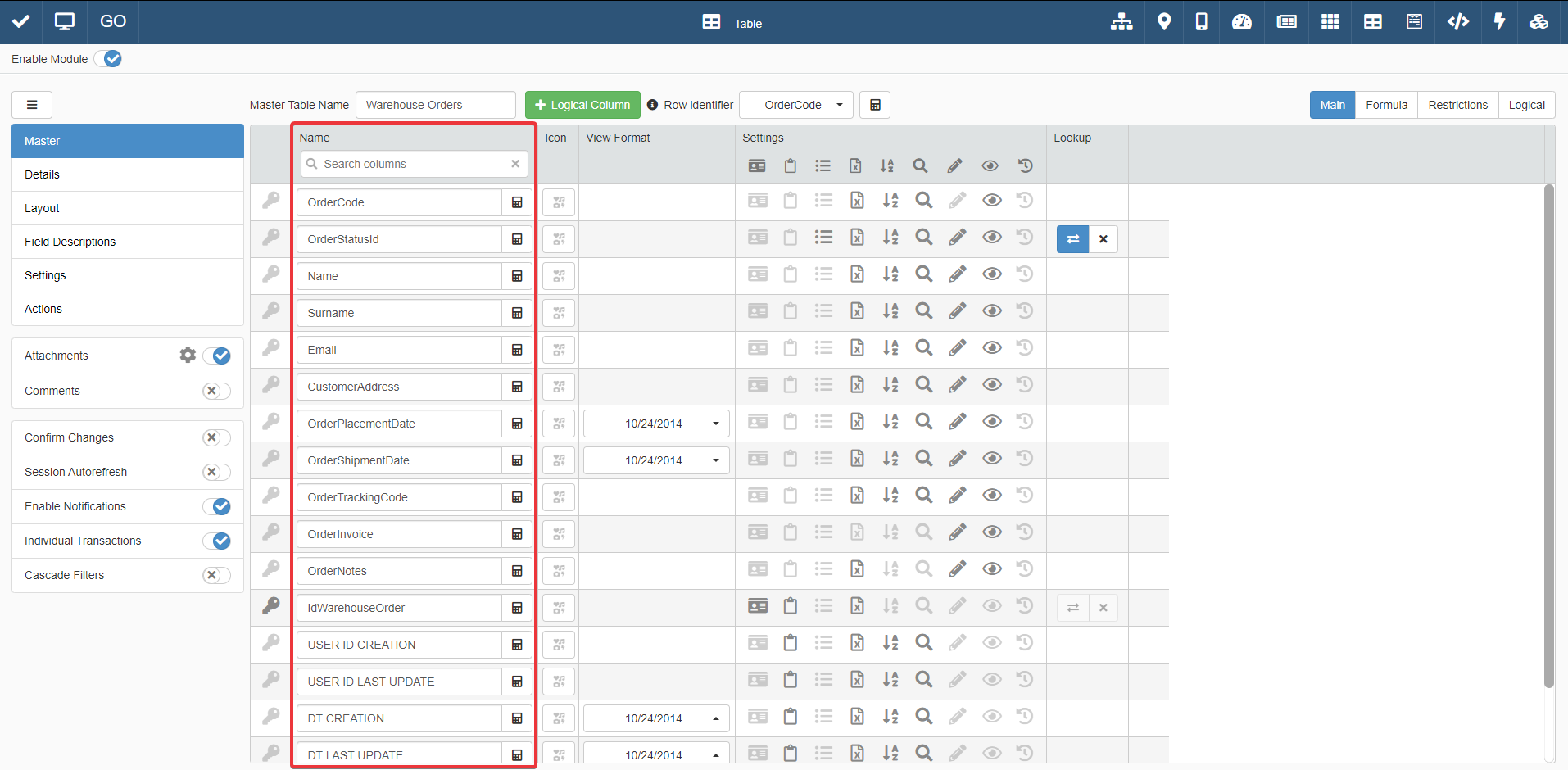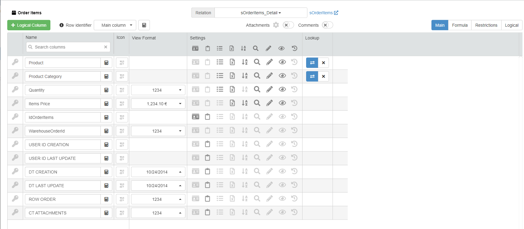 For a Detail Table, you find the same interface by going into Details > [Desired Detail table] > Configure.