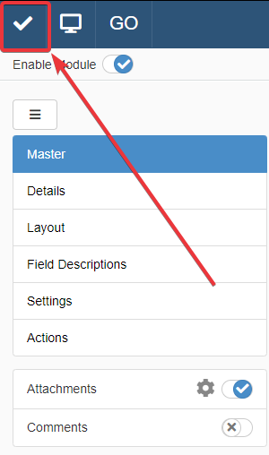 For Master Table, you can find the table settings under the Master sub-panel. The Master sub-panel is the first panel opening by default when you access the Design Mode.