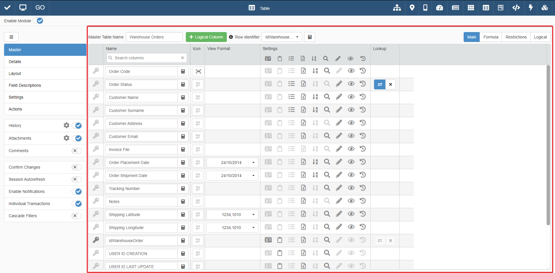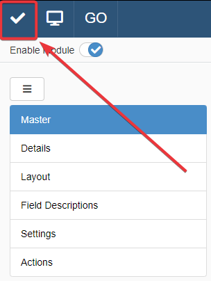 For Master Table, you can find the table settings under the Master sub-panel. The Master sub-panel is the first panel opening by default when you access the Design Mode.