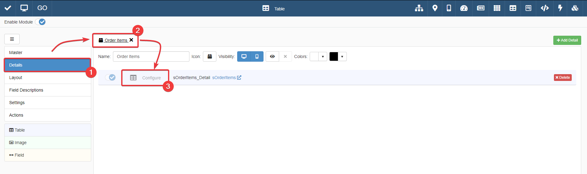 For Detail tables, you must go to the Details sub-panel. Choose one of the Detail tables, and click on Configure.