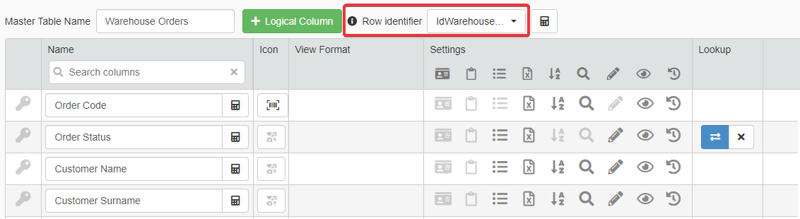 Above the table's settings, the Row Identifier drop-down lists displays the fields that you can use as Row Identifiers.