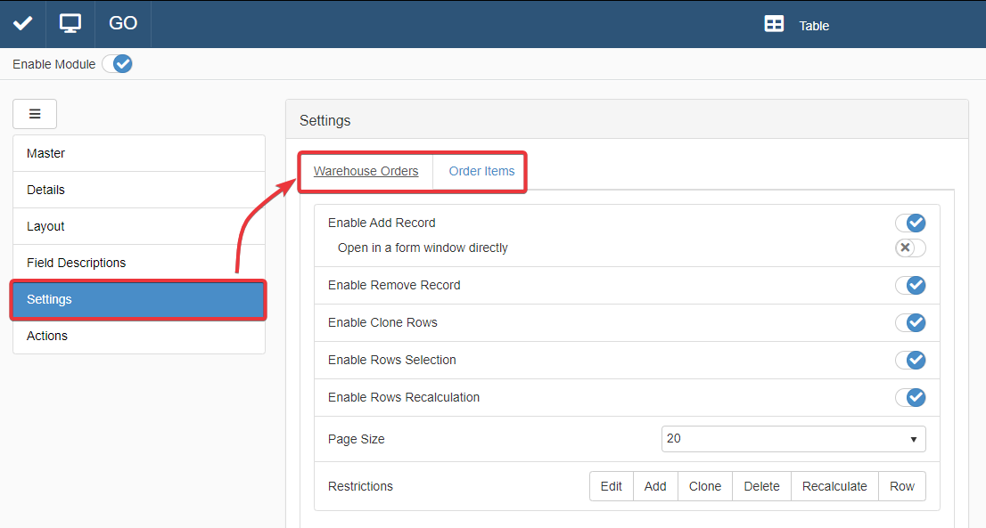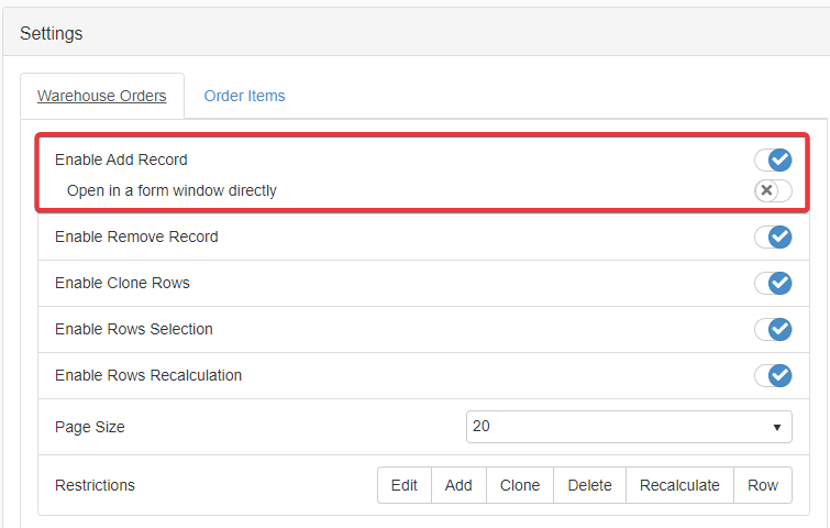 Under the corresponding table's tab, click on Enable Add Record toggle switch to enable or disable the possibility to add rows.