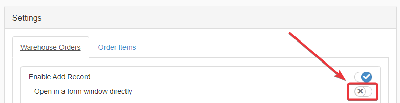 By default, the Enable Add Record is enabled and Open in a form window directly is disabled.