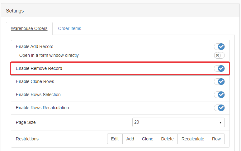 Under the corresponding table's tab, click on Enable Remove Record toggle switch to enable or disable the possibility to delete rows.