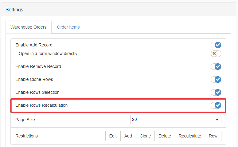 Under the corresponding table's tab, click on Enable Rows Calculation toggle switch to enable or disable the recalculation of cell rows' values based on Formulas.