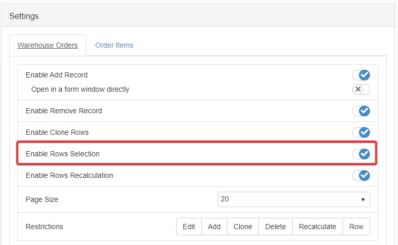 Under the corresponding table's tab, click on Enable Row Selection toggle switch to enable or disable the possibility to select single rows.