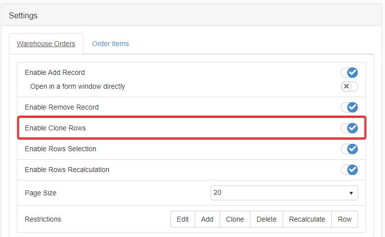 Under the corresponding table's tab, click on Enable Clone Rows toggle switch to enable or disable the possibility to clone rows.
