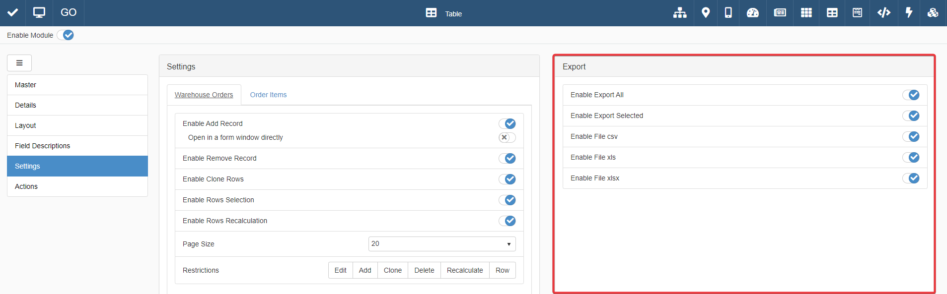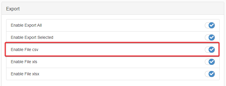 In the Export sub-section, click on the toggle-switches of the formats you want to enable or disable for the users.