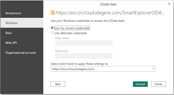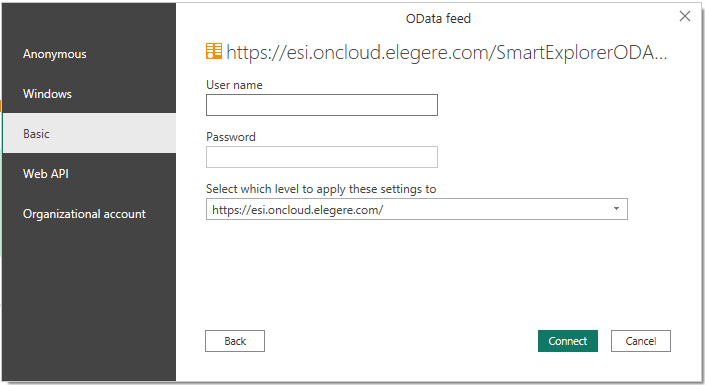 When providing ODATA Feed to Microsoft Power BI, eLegere supports only the Basic Authentication and Windows protocols.