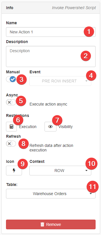 optionalIf enabled, the application refreshes the data on the table when the Custom Action has finished to run. - (9) Icon