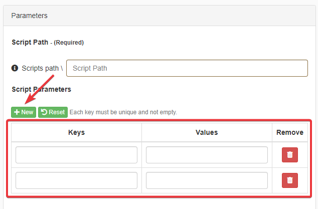 Clicking on New inserts a couple of key and value. Insert in the line the key and the value from the application to be passed to the Powershell Script.