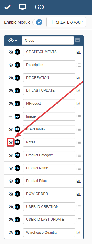 In the Properties panel, click on the icon next to the Property to be hidden. This action switches the icon to , hiding from the Group and the application the chosen Property.