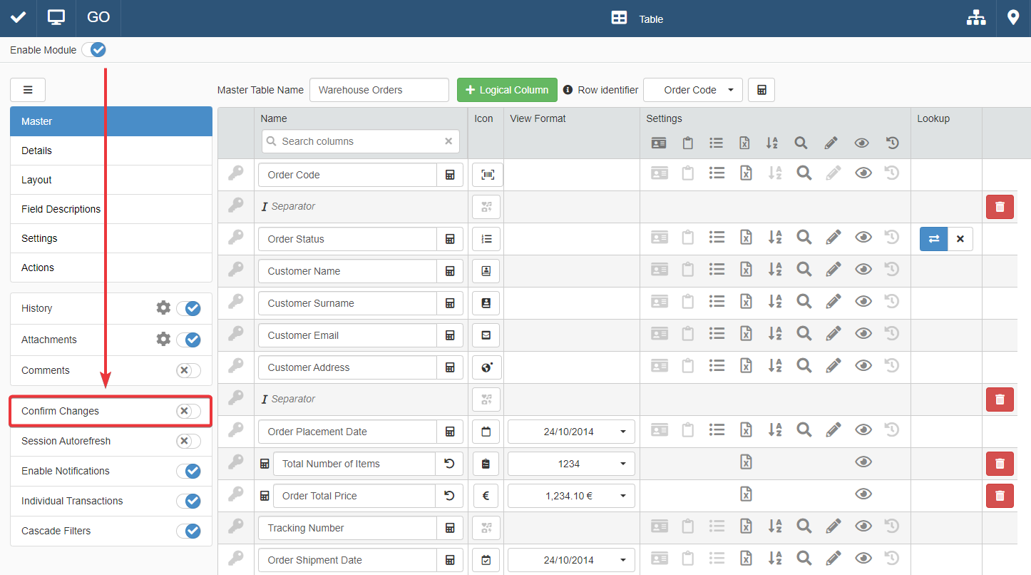 Learn how to configure an application to ask for confirmation before saving any changes on a table.