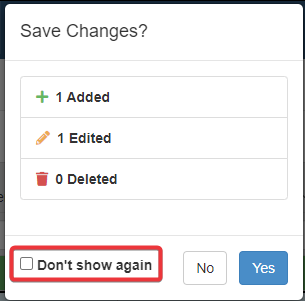The confirmation window will appear at each save, unless the user flags the option Don't Show Again.