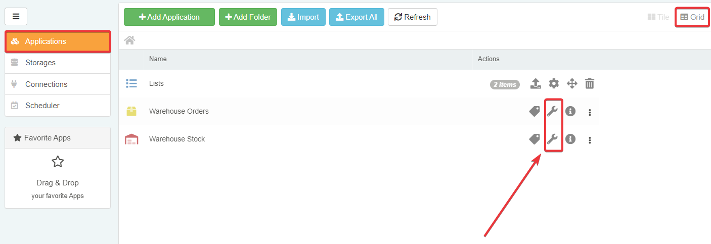 If you are in the Grid view in the Application panel, you find the icon on the application's row.