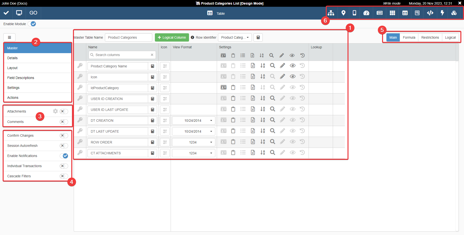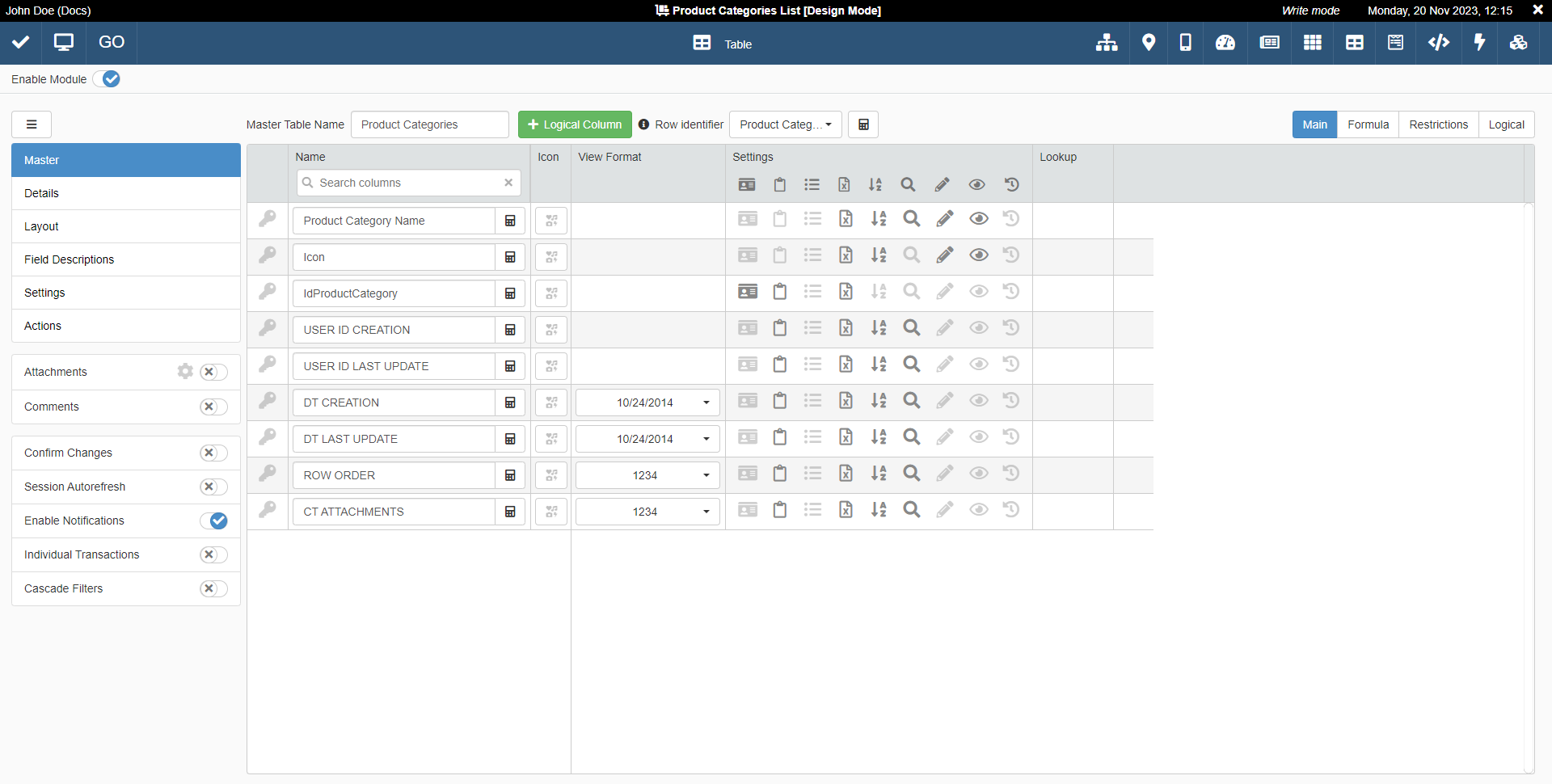 You can configure and customize applications through the Design Mode. Design Mode is the interface enabling you to customize any aspect of an applications: layout, columns, automated actions and calculations, view permissions, and edit data.