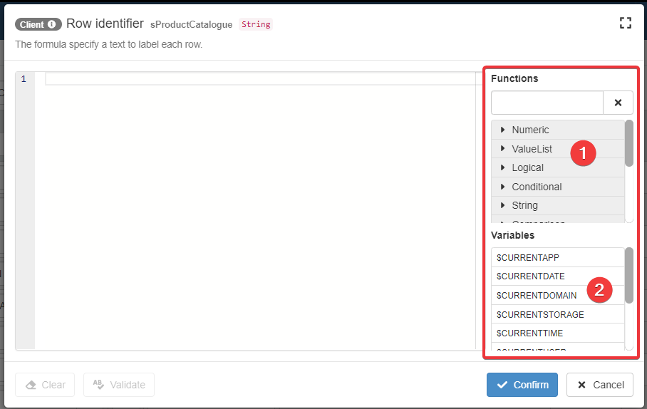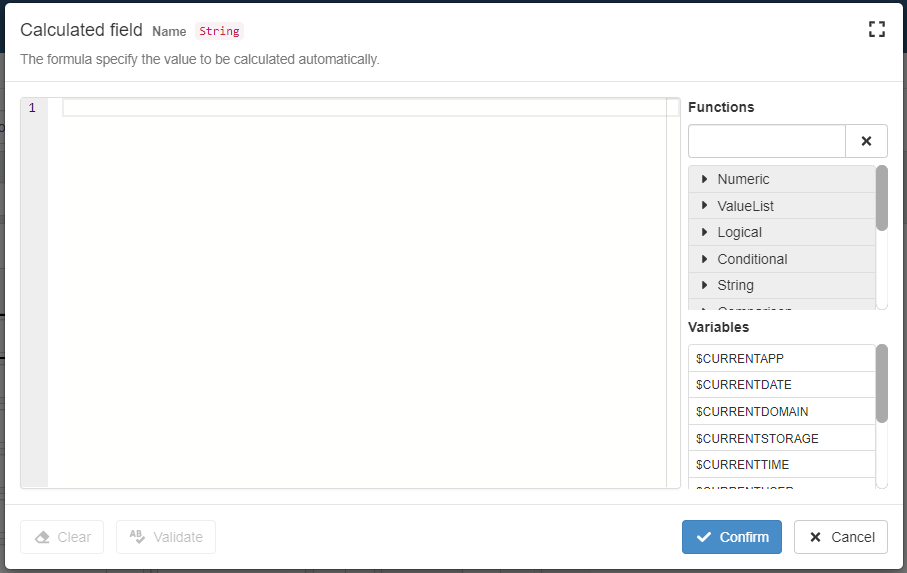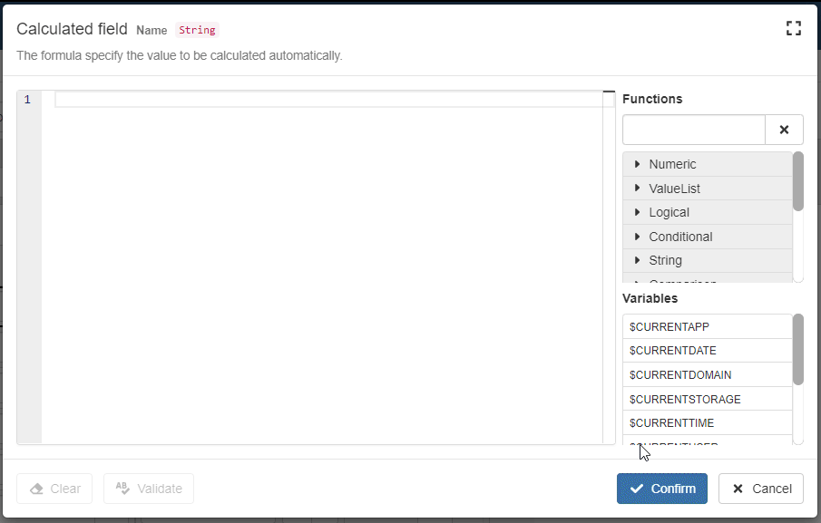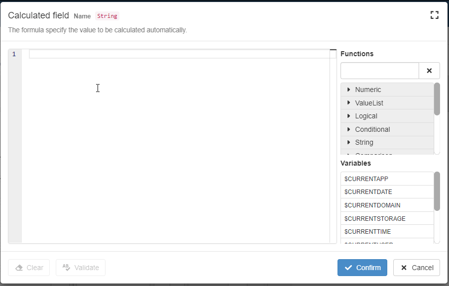 The Formula Editor provides an helper listing more features to support formulas writing and speed up your work.