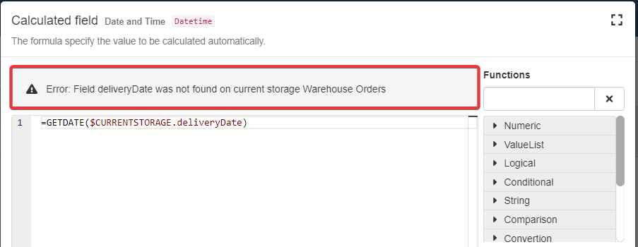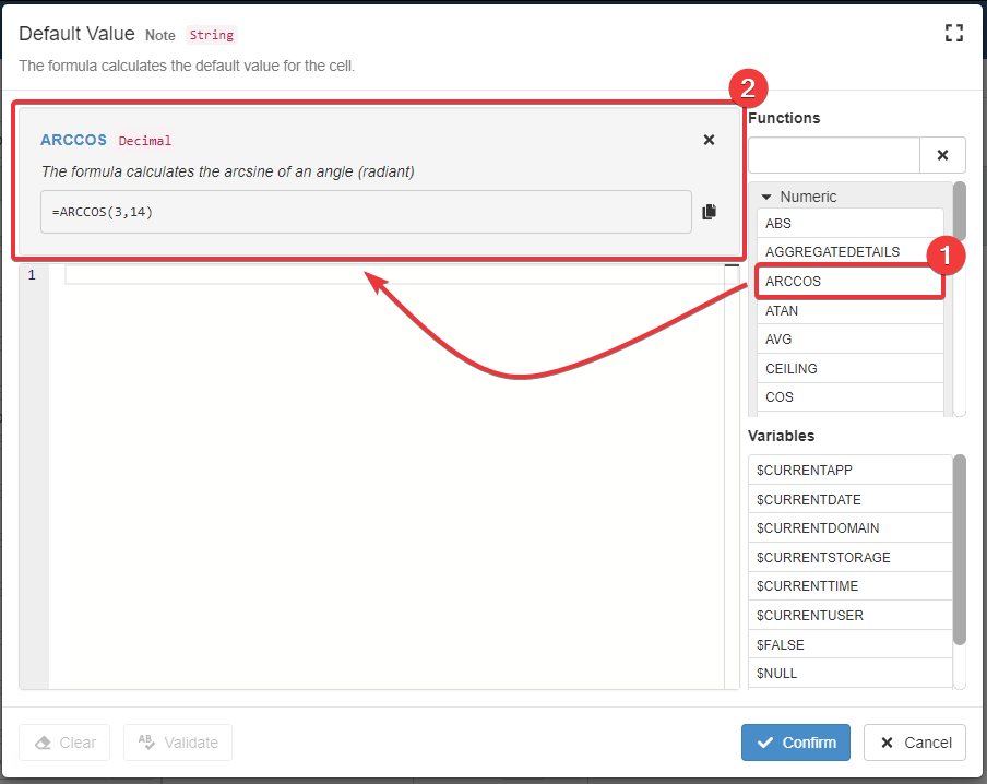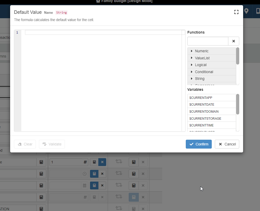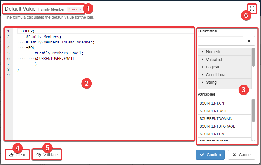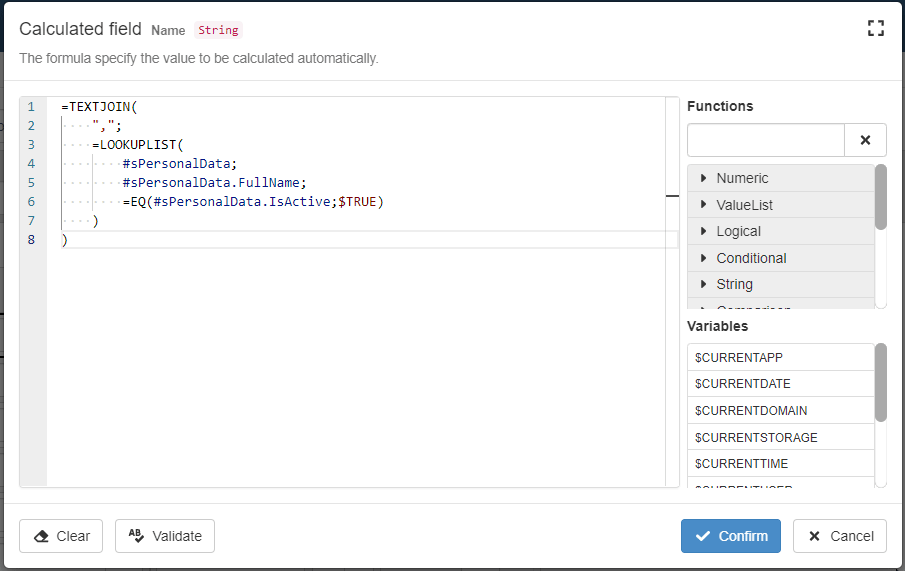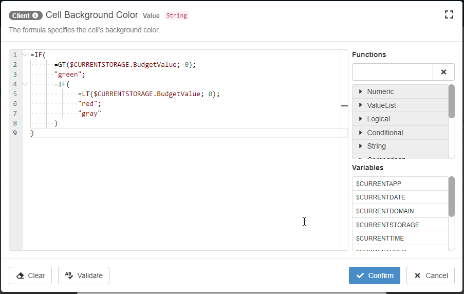 The Formula Editor will validate the formula when you click on the Confirm button as well. If there is a syntax error, the Formula Editor won't proceed with the saving. The Formula Editor will request a correction in this case.