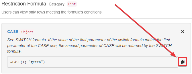 - This section displays in order from left to right: what the formula is going to do (e.g. Color, Restriction, etc.), the field's name, and the expected data type (e.g. String, Numeric, Date, etc.)