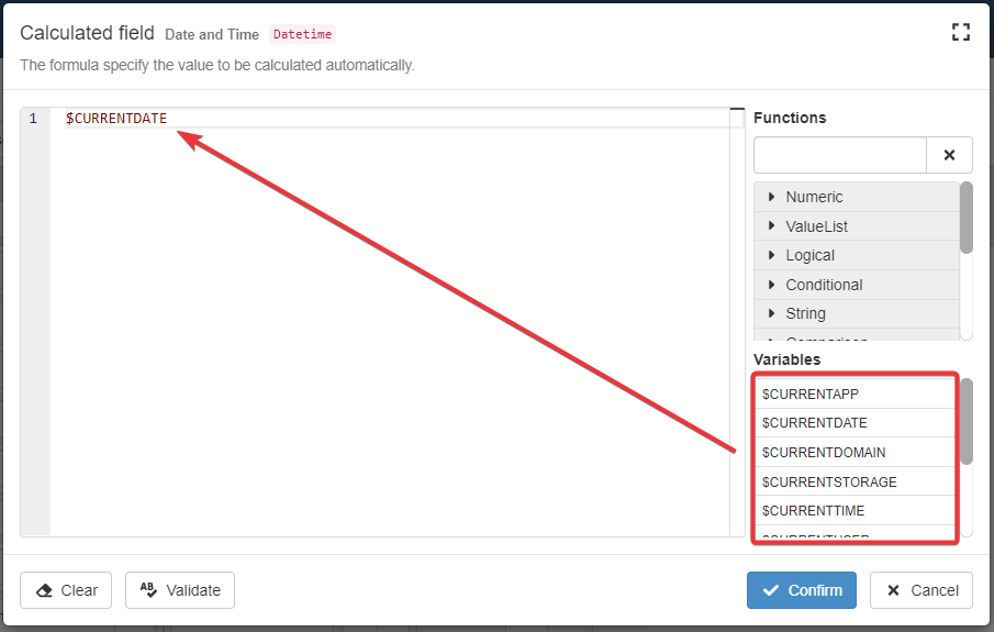 - The Validate button verifies the formula's syntactic correctness.