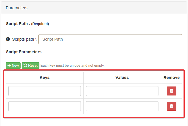 You can specify additional parameters and keys for a Powershell. Click the New in the Custom Action's Parameters settings. The action enables to add a new couple of parameters and values.