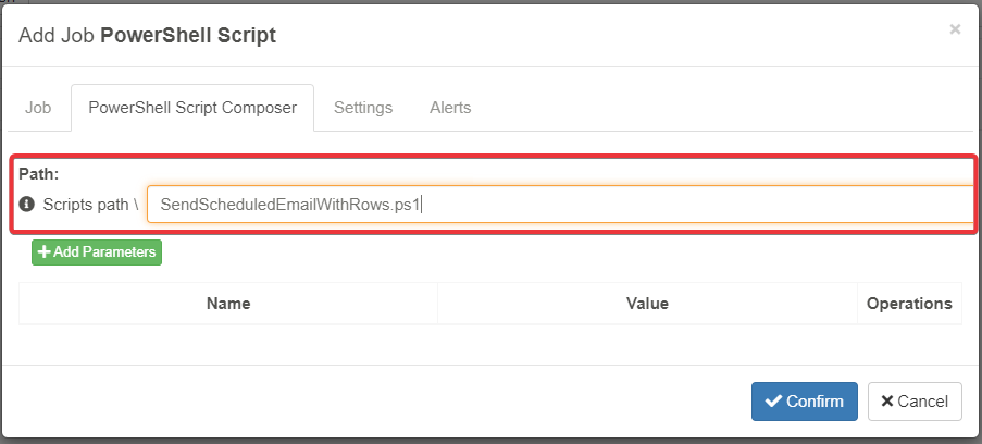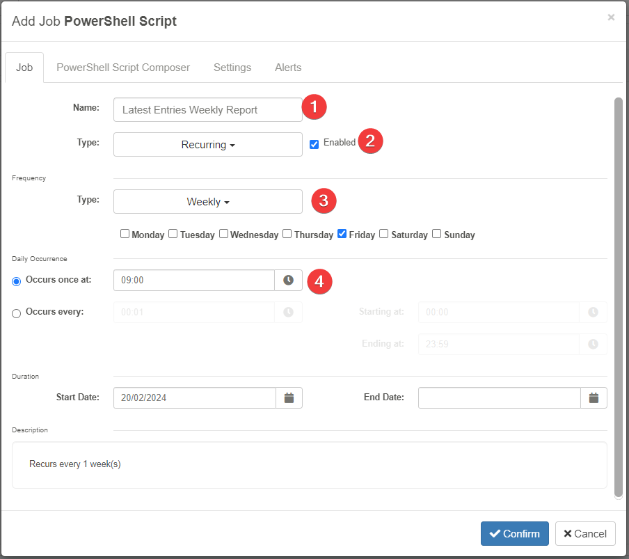 Once you have created the action, follow the steps to set up all the required settings in the Add Job window to select the Powershell script.