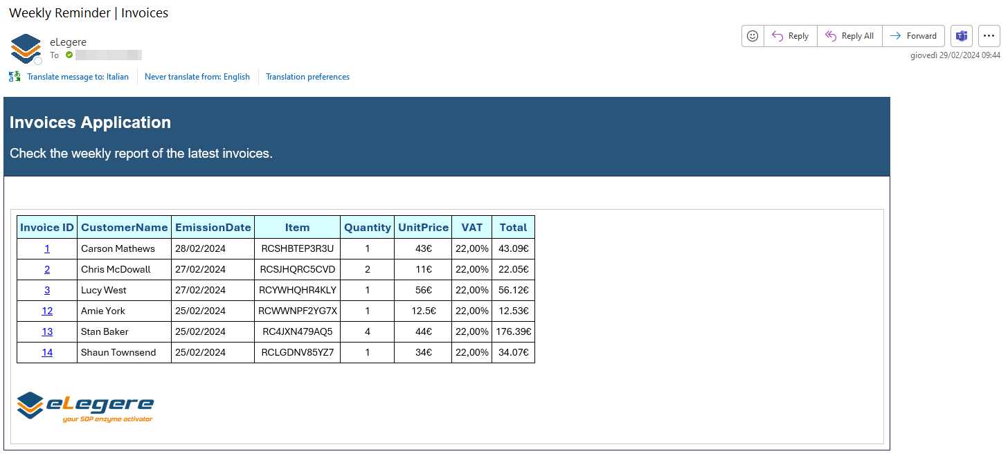 You will receive a email notification each Friday informing you of the latest entries. Clicking on the Invoice ID opens the row in the application.