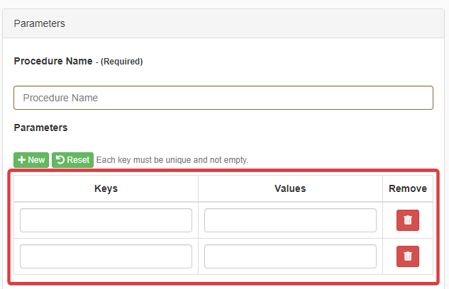 In Stored Procedures type Custom Actions, you can add parameters and values besides those described in SQL Parameters above. Click the New in the Custom Action's Parameters settings. The action enables to insert a new couple of parameters and values.